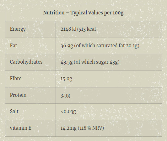 Ingredients: Isomaltulose, Cocoa mass, Cocoa butter, Galactose, Inulin, Coconut Flakes (7.5%), natural coconut aroma, Vitamin E, Emulsifier: Soya lecithin.