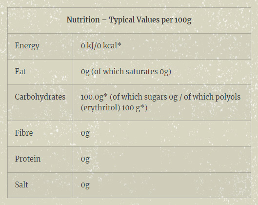 *Because erythritol is not utilisable by the body it is valued at 0 calories and need not be considered when counting your carbohydrates! Erythritol is a carbohydrate, but as a polyol it has different characteristics to sugar!
