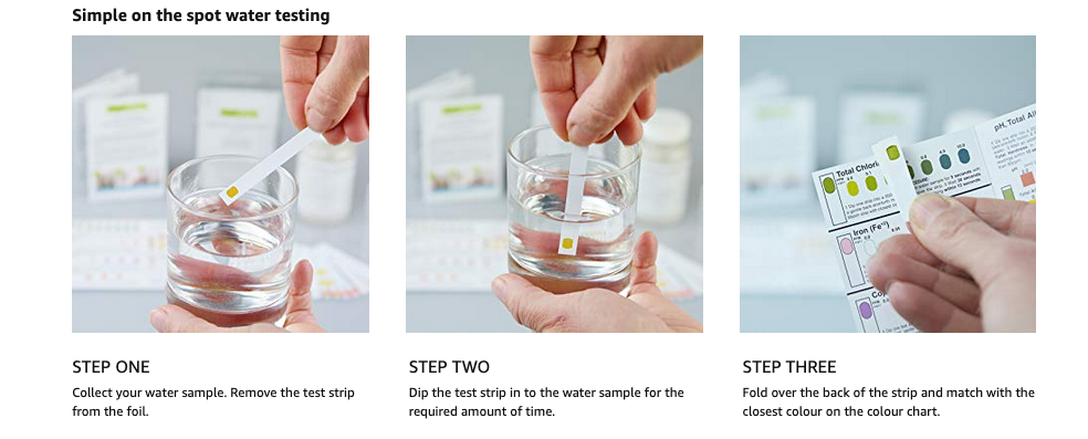 - Detailed instructions, color chart, and comparison table to drinking water guidelines