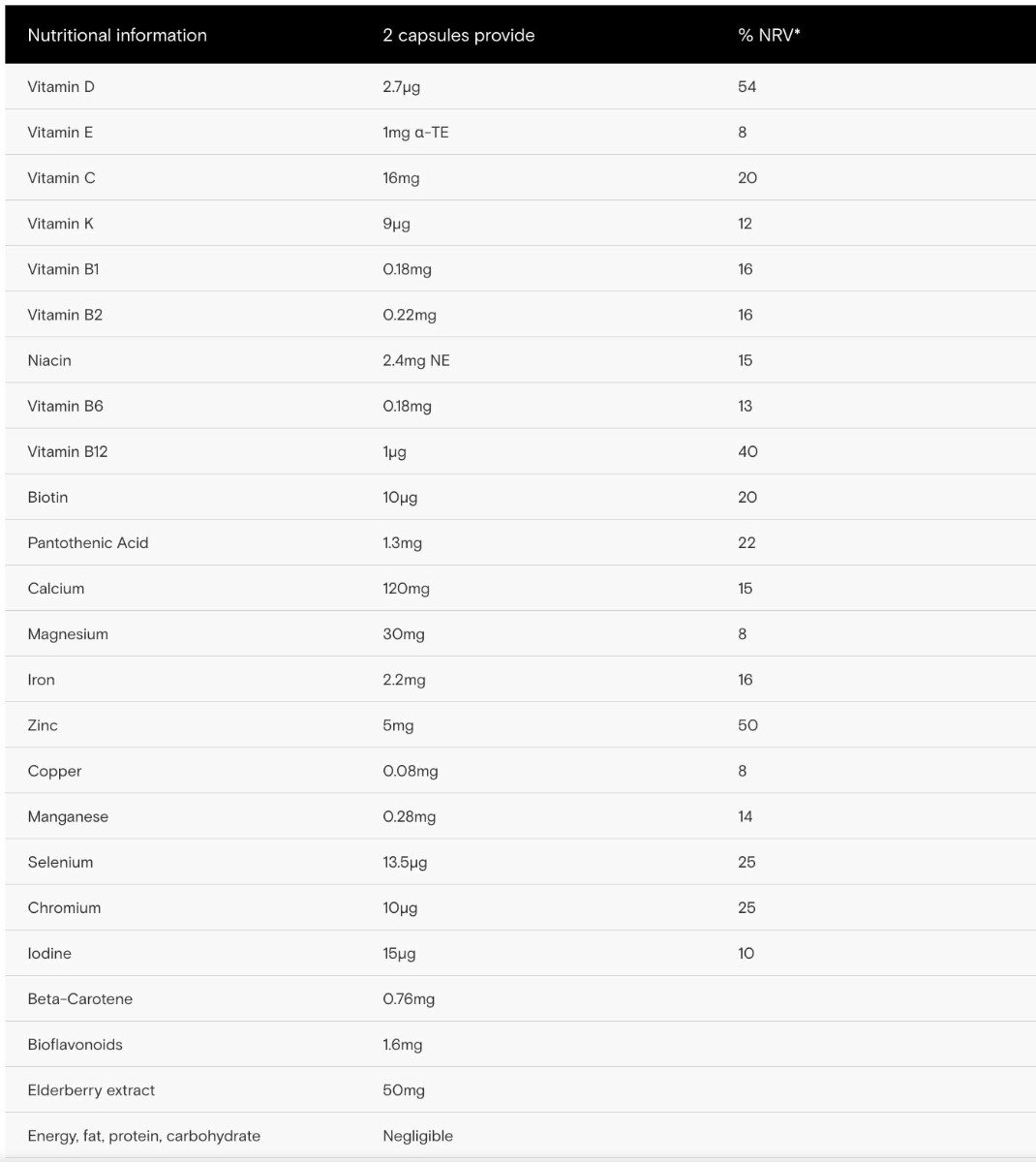 Ingredients: Lithothamnium Calcareum (Red algae) powder (providing Calcium), Nutrient-enhanced Lactobacillus Bulgaricus (providing Magnesium, Zinc, Pantothenic acid and Copper), Vegetable cellulose (capsule shell), Nutrient- enhanced Yeast (providing Iron, Selenium, Niacin, Manganese, Chromium GTF, Riboflavin, Biotin, Iodine, Vitamin K1, Vitamin B6, Thiamin, Vitamin B12 and Vitamin D3), Nutrient-enhanced Citrus pulp (providing Vitamin C and Bioflavonoids), Elderberry extract, Carrot concentrate (providing Beta- carotene) and Nutrient-enhanced Yellow Pea (Pisum Sativum) preparation (providing Vitamin E).